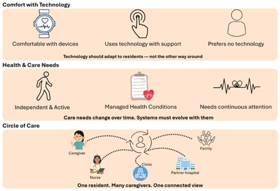 Residents wanted to live independently, stay socially active, and not feel “medicalized” in their daily lives. Care teams, on the other hand, needed timely health insights, early warnings, and a way to respond quickly when something didn’t look right. Families wanted reassurance—without constant phone calls or visits.