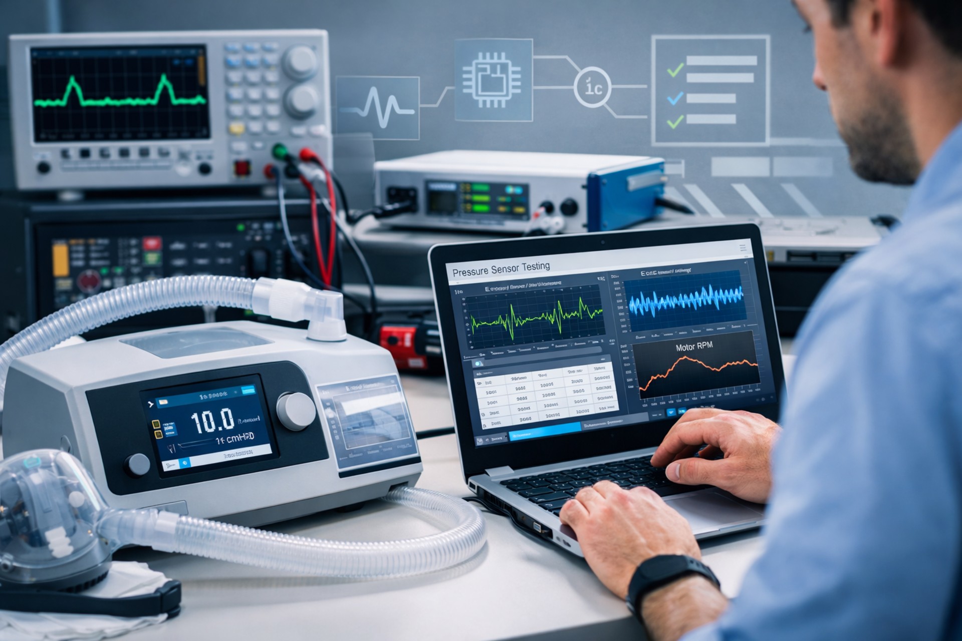 The LabVIEW-based automated test architecture enables scalable medical device validation, traceable test execution, and regulatory-aligned documentation for CPAP/BiPAP systems.