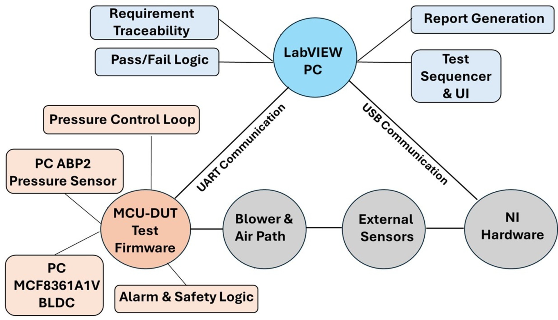 LabVIEW acquires motor RPM and fault status via the MCU over UART, correlates these parameters with externally measured pressure and flow where applicable, and automatically evaluates the results against predefined acceptance criteria to generate objective pass/fail outcomes with full data traceability.