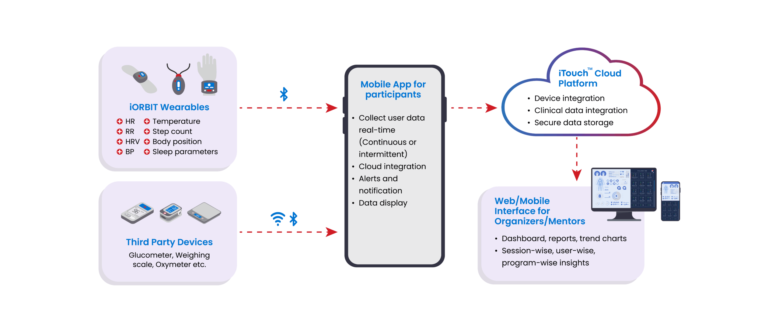 With iOrbit’s wearables and iTouch platform, wellness planners can seamlessly capture physiological data from multiple devices, receive automated alerts and reminders to boost adherence, and access actionable insights for personalized guidance and overall program evaluation.